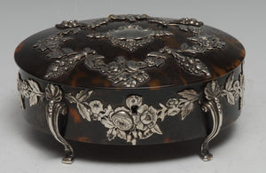 A Victorian silver mounted tortoiseshell oval dressing table jewel casket, George Fox, London 1892
